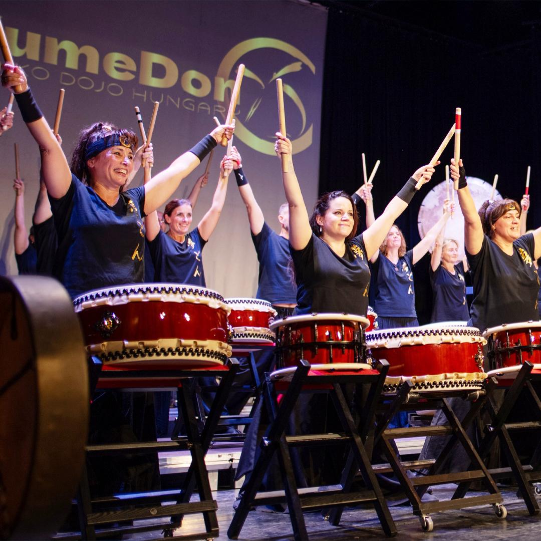 A YumeDon Taiko Stúdió előadásán több mint húsz dob szólal meg a színpadon.