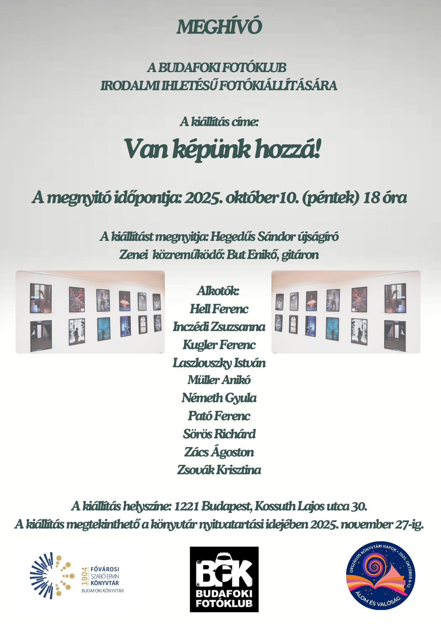 A Budafoki Fotóklub irodalmi ihletésű csoportos fotókiállítása Az Országos Könyvtári Napok keretén belül kerül megrendezésre a Budafoki Fotóklub irodalmi ihletésű csoportos fotókiállítása. Az eseményt megnyitja: Hegedűs Sándor újságíró Gitáron közreműködik: But Enikő